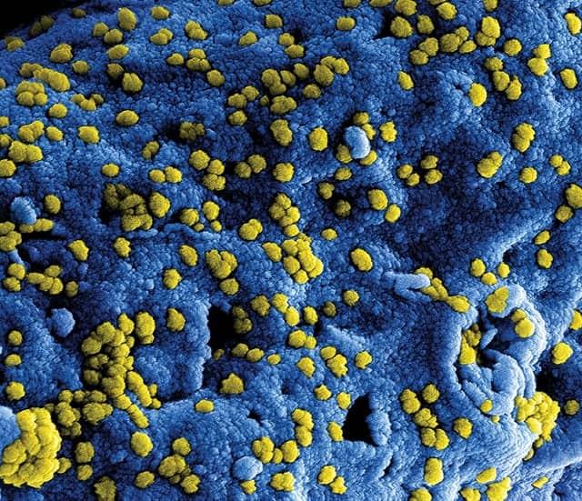 Colorized scanning electron micrograph of Middle East respiratory syndrome coronavirus (MERS-CoV) particles (yellow) on the surface of a Vero E6 cell (blue). A zoonotic disease of great concern globally, MERS-CoV currently represents a low risk to the US public. Source: National Institute of Allergy and Infectious Diseases.