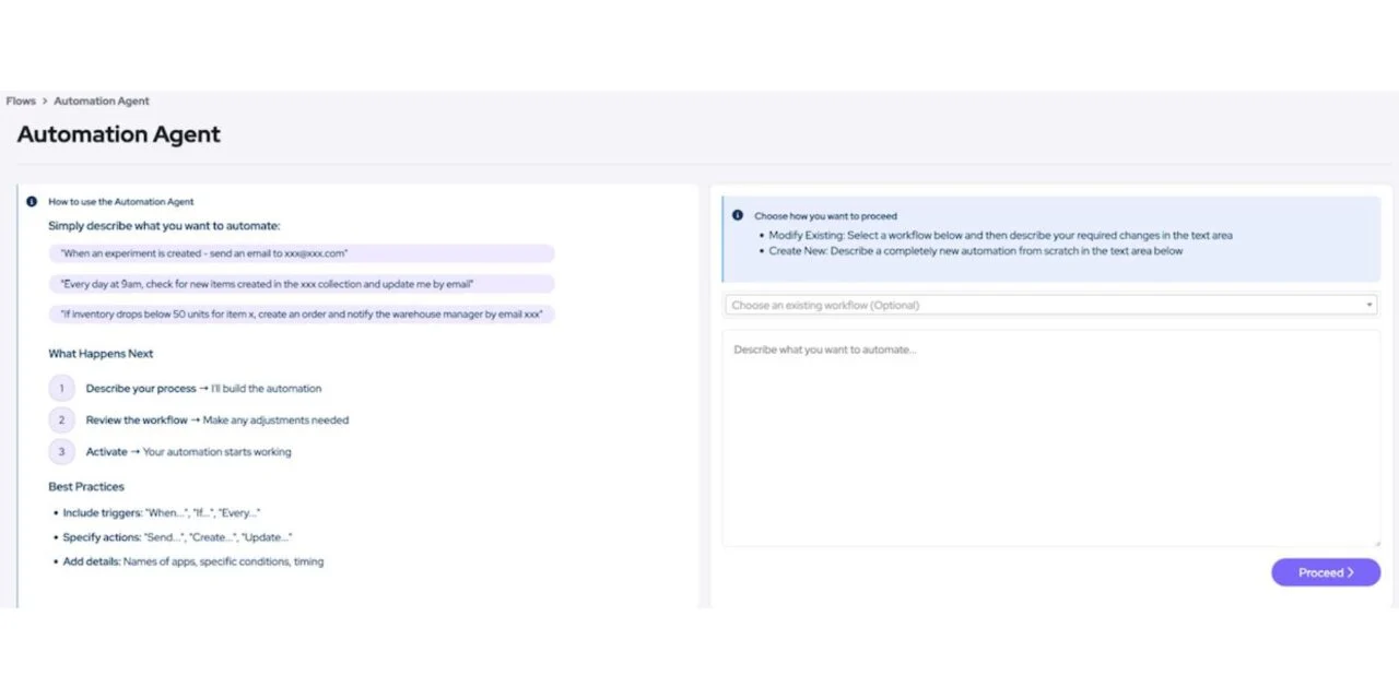 The automation agent uses Labguru data and integrations with external systems to create event-driven workflows triggered by experiment status, quality control thresholds, or sample changes. The workflows remain fully visible, editable, and compliant with FDA 21 CFR Part 11 and GxP requirements.