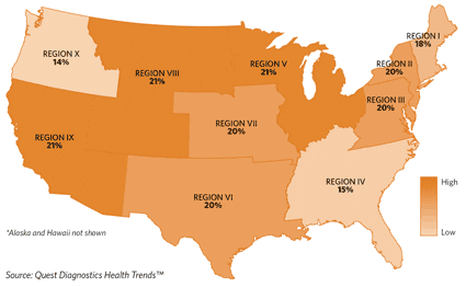 Quest Diagnostics draws on a database of deidentified testing based on more than 1.5 billion patient encounters since January 2000 to produce national health analyses for peer review publication and the general public. These “Quest Diagnostics Health Trends™” reports evaluate the impact of chronic diseases, such as cardiovascular disease, gestational diabetes, and hypothyroidism, and other conditions affecting large numbers of Americans.